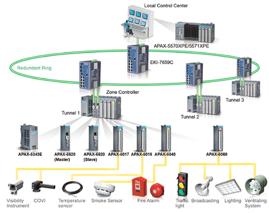 The zone controllers are used to collect information from field testing devices, process the information and send the information to the local control center. Control commands from the local control center are then sent to the zone controllers in order to directly control the corresponding devices. If the connection between the local control center and zone controllers is broken, the zone controllers can independently control field devices. Therefore, the zone controllers must be highly reliable. Advantech PAC is used as tunnel monitoring zone controller (APAX-5520KW). It supports backup functionality. Each controller offers serial port to communicate with other industrial devices. APAX high-performance I/O modules could meet signal processing commands of monitoring system. Every module is stacked and provides multiple functionality and program capacity, and is easy to detach and maintain.